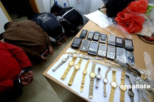 三月十二日,一伙盗窃分子在福州台江刑侦大队背对赃物,准备接受审问。福州警方近日破获一起盗窃团伙案,八名四川籍犯罪嫌疑人因撬开沿街商铺盗窃名表、手机、电脑等贵重物品被捕。中新社发 王东明 摄