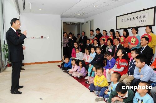 当地时间三月十二日,正在美国访问的中国外交部部长杨洁篪来到中国驻美大使馆视察中国250多家驻外使领馆中的一所学校——驻美使馆阳光学校。杨洁篪在和学校孩子们交谈时鼓励他们学说中国话,学写中国字,学做中国人,并为阳光学校题写校训:“爱国励志勤学奉献”。图为杨洁篪在和阳光学校老师和孩子们交流中。 中新社发 邱江波 摄