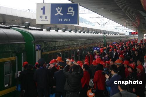 3月12日下午,大陆首个火车专列赴台旅游团从浙江义乌出发。千余名大陆游客将通过火车专列至厦门,渡海过金门后乘飞机赴台湾旅游。据组织者浙江中旅出境中心总经理曹军介绍,这也是大陆赴台旅游人数最多的单个团队,本月14日和4月初将还有2000多名游客通过这一方式赴台旅游。中新社发 王旻 摄