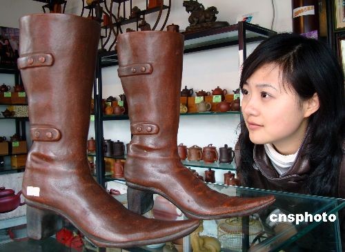 2009年3月13日,江苏苏州一紫砂工艺品商店内摆放的“紫砂女靴”工艺品吸引了许多顾客的目光。这些由宜兴紫砂工艺师采用全手工方式制作的“紫砂女靴”惟妙惟肖,受到顾客的青睐。中新社发 王建康 摄