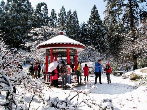 受冷空气影响,江西庐山喜降春雪,把庐山装扮得分外妖娆,大批中外游客纷至沓来。图为三月十四日拍摄的江西庐山小天池诺娜塔的雪景。中新社发 李忠东 摄
