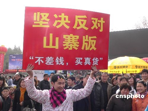 3月15日,在郑州紫荆山广场3·15活动现场,“山寨版”小沈阳将“坚决反对山寨版”的牌子高高举起,倡导民众买真货。中新社发 王中举 摄