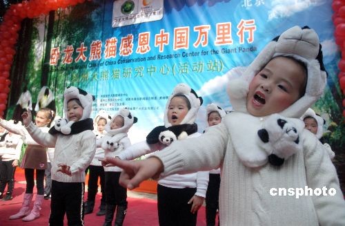 2009年3月15日,为了感谢各地对卧龙大熊猫的爱心援助,在汶川地震发生即将一周年之际,由四川卧龙中国保护大熊猫研究中心主办的“感恩世界点亮希望 卧龙大熊猫感恩中国万里行”活动福州站在福州熊猫世界举行。中新社发 张 斌 摄