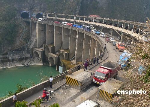 3月17日,湖南桑植县贺龙水电站大坝公路桥大塞车,大批车辆滞留坝顶。湖南省张家界市桑植县贺龙水电站是以贺龙元帅名字命名的水利工程。电站水库大坝为空腹坝,坝顶建有公路桥连接305省道。为确保大坝安全,该县对荷重超过10吨,宽度超过3.25米的车辆限制通行,公路桥两端设有限宽障碍。超标车辆多走10多公里绕道行驶。但一些超标车辆试图强行通过,加上部分司机车技不熟练,通过缓慢,影响后续车辆通行,导致路道常常大塞车。中新社发 唐荣沛 摄