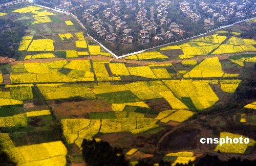 3月18日,从飞机上俯瞰成都平原,田野里盛开的油菜花美如油画。中新社发 廖攀 摄
