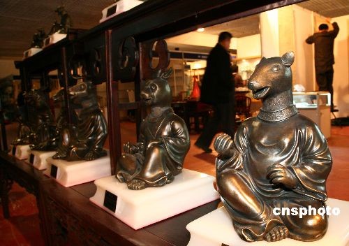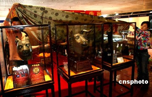 3月18日,圆明园兽首在第七届全国工艺品、旅游品、礼品博览会上亮相。当日,第七届全国工艺品、旅游品、礼品博览会在大连星海会展中心展出,圆明园十二生肖兽首精仿品亮相。这次展出的兽首分全套缩小比例展品部分和全套人身兽首缩小比例部分,其中,牛首、兔首和鼠首均是按照实物1:1比例设计制作的。中新社发 徐德武 摄