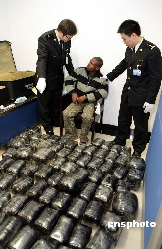 近日,北京首都机场海关在一男性旅客的行李中查获毒品大麻可疑物72包,毛重87.25公斤。此案是首都机场海关旅检现场今年首次查获采用大批量客带货方式走私毒品入境案。嫌疑人在通关过程中采用极为少见的运带方式运带毒品。中新社发 雷虹 摄