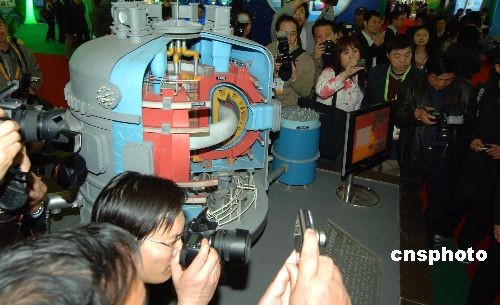 3月18日,由中国科技部主办的“2009年中国国际节能减排与新能源博览会”在北京展览馆开幕。科学技术部部长万钢与嘉宾,以充沛的精力出席了开幕式。中国的“EAST全超导托卡马克核聚变试验装置”模型,引起北京百家媒体记者高度关注。此核聚变项目是2006年8月世界上第一个建造成功的非圆截面“EAST全超导托卡马克核聚变试验装置”,是中国当时的一项重大的科学成果。中新社发 邹宪 摄