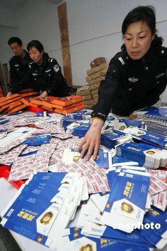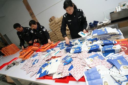 3月18日,河南许昌市魏都公安分局民警在涉嫌制造假药窝点统计查获的假药及药品标签、药盒等。当日,魏都警方接群众举报,在一闲置厂房内查获涉嫌制造假药窝点,当场查扣涉嫌假冒药品10多种,半成品药品、包装箱、合格证、防伪标识等1000多件,涉案值达2000余万元。假冒药品有五豆平糖胶囊、肾金子、肾黄金、协和降脂等10多种,药效包含降压、减肥、壮阳滋补等。药品的制假技术很高,须借助仪器检测才能区别。此案正在进一步调查处理中。中新社发 牛书培 摄