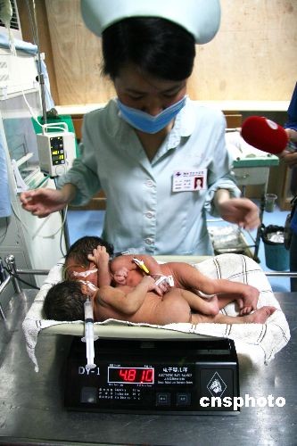 三月十九日,湖南省儿童医院对刚刚转诊到医院的一对连体女婴进行详细全身检查,初步诊断为对称性剑-脐连体女婴,胸骨下端与脐部腹壁相连、共肝,病情危重。十六日八时许,二十八岁的段晓艳在湖南娄底新化县中医院妇产科剖腹分娩出这对连体女婴,体重四点八公斤。中新社发 李奇 摄