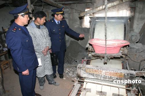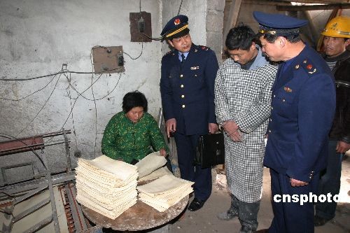 3月19日,江苏连云港墟沟工商所在连云区城乡结合部简明平房查处一无证煎饼黑作坊。执法人员现场发现,原料库内堆放着做煎饼的原料,原料包装物上没有任何标志,无合格证。加工间狭小、设备简陋,隐蔽在简易破旧的平房内,做饭、加工于一体。场所内两口盛面糊的大缸周围污秽不堪,污水遍地,卫生状况十分恶劣。煎饼主要送往城区市场、学校周边及工业区外来人员上班经过的地方销售。执法人员当即责令煎饼作坊停止生产,并对加工机器予以查封。中新社发 王健民 摄