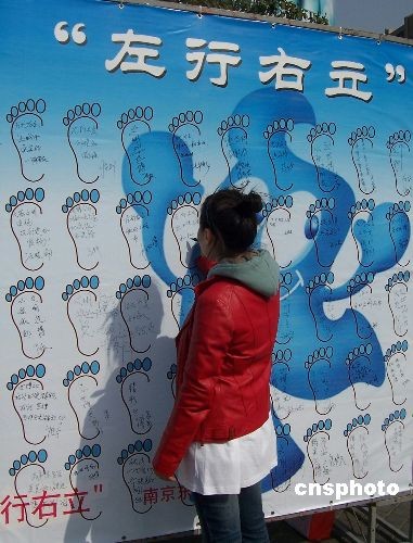 3月20日,上海黄浦区青年迎世博志愿者特别行动在南京路地铁下沉式广场举行。现场设立迎世博文明墙,邀请市民参与世博文明倡议。并进行世博志愿者,左行右立地铁文明乘梯、造血干细胞捐献等志愿者的招募活动。中新社发 周东潮 摄