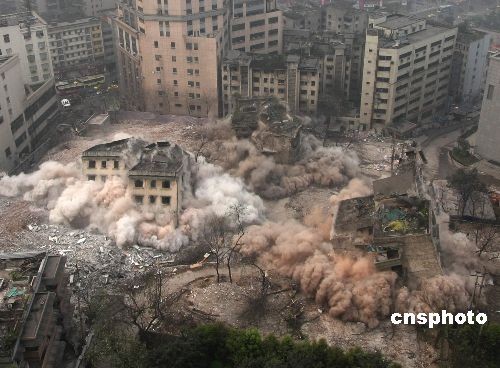 2009年3月21日,重庆江北区观音桥处成功进行了危旧房定向爆破。当日早晨8时,一声巨响,当地渝北二村二号地块的6栋楼房被爆破拆除,总面积1000平方米。这是重庆2009年危旧房改造的第一爆,是观音桥商圈快速推进“长江上游商贸中心”的重要举措。中新社发 贺终荣 摄