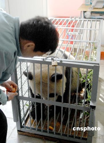 3月22日,在北京动物园生活了9个月的8只奥运大熊猫开始起程返回四川老家。临行前,工作人员正在喂大熊猫食物,并依依不舍为其送行。中新社发 郑雄增 摄