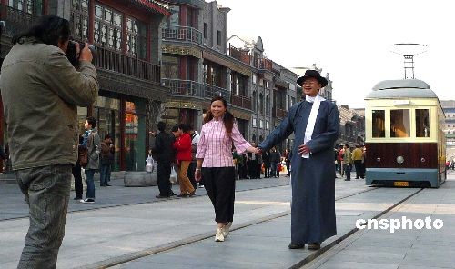 3月23日,在北京前门大街,一对年轻情侣身穿旧时中式服装留影,吸引了过往行人的目光。 中新社发 玉龙 摄