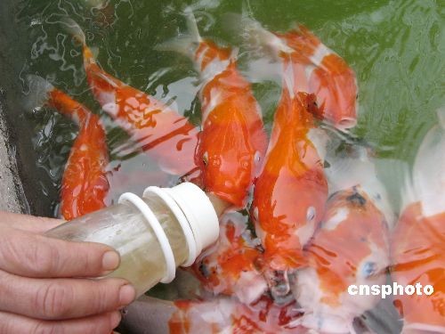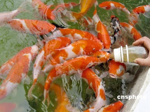 3月25日,在湖北宜昌公园,用奶瓶进食的“吃奶鱼”引来许多市民围观。该鱼是原产日本的锦鲤,寿命在百岁以上,奶瓶装的是高档饲料。中新社发 韩玉洪 摄