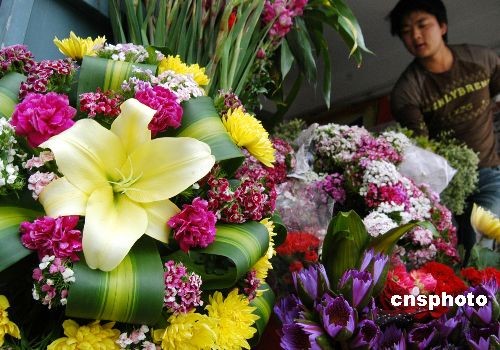3月26日,在福建泉州风俗扫墓的第一天,市区花店收到了许多简易花圈的订单。在金融危机的大形势下,市民放弃以往奢华的花篮花圈,大多挑选简易花束、花圈祭祖。中新社发 傅丹丹 摄