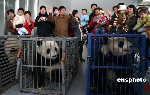 2009年3月26日,在南京红山森林动物园生活了近一年的美灵、晶晶、仙子三只大熊猫即将返回四川卧龙老家,众多市民专程赶来为大熊猫送行。2008年4月18日,来自四川卧龙中国保护大熊猫研究中心的三只3岁左右的大熊猫租借到南京红山森林动物园。中新社发 阿董 摄