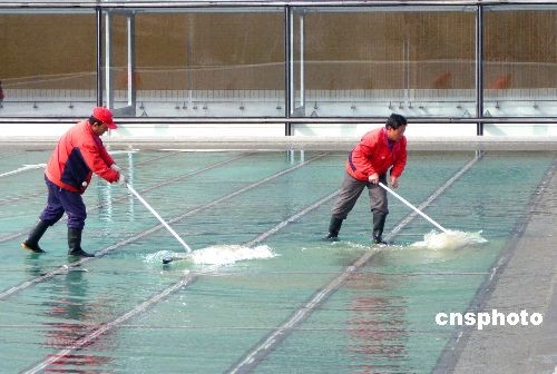 2009年3月26日,北京国家大剧院旁,两名保洁员在认真清理景观池玻璃上的积水,进行正常的维护保养。中新社发 玉龙 摄