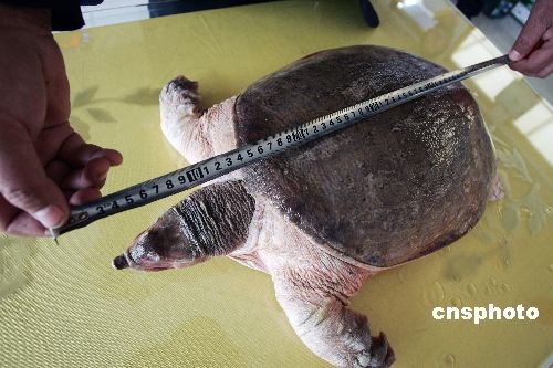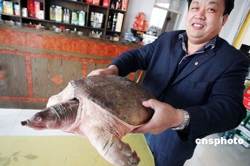 3月28日,山东潍坊市民刘先生日前从水产市场购得一只野生巨型甲鱼。据了解,这只甲鱼体长60多厘米,背甲最宽处有38厘米,甲鱼伸出脖子后体长近90厘米,甲鱼背壳呈灰黄色,腹甲为淡黄色,裙边肥厚,趾甲都有1厘米长,体重达11公斤,是从潍坊峡山水库捕捞上来的。刘先生说,将选择良辰吉日将这只巨型甲鱼放归它原来的栖息地。中新社发 张驰 摄