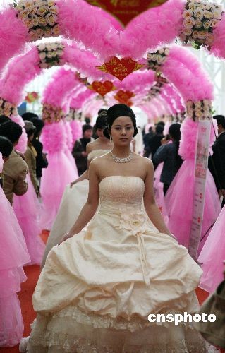 3月29日,在南京国际展览中心举办的2009南京首届婚庆文化博览会上,组委会特意制作了一座2009分米长的婚庆彩门,这座婚庆彩门由60个彩色拱门组成,每15个彩色拱门为一种主色调。据介绍,这座婚庆彩门是世界上最长的婚庆彩门。中新社发 钟山 摄