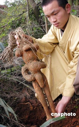 3月29日,福建泉州南少林寺武僧在观音阁旁山坡取土时,挖出一株根部酷似男性人形“善财童子”的根茎植物。该株“人形”植物长约30厘米,宽约13厘米,人体特征齐全,手脚分明逼真。据相关人员介绍,这样的根茎植物生长需要数十年的时间,尤其在即将落成开光的观音阁边上出现尤为有趣。中新社发 傅丹丹 摄