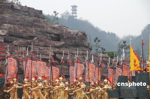三十日上午九时五十分,以“万龙归宗,祈福中华”为主题的第二届中国郑州炎黄文化周在郑州黄河风景名胜区隆重举行,来自海内外的万余名炎黄子孙出席了开幕式。图为“御林军”助威文化周。中新社发 史宝银 摄