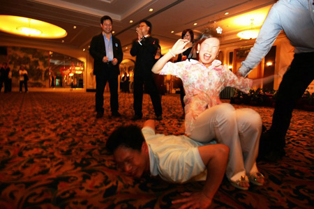 窈窕淑女放下平日的矜持,游戏中坐在素昧平生的男士背部……3月29日晚,一场白领相亲晚会在罗湖区香格里拉大酒店举行,近500名男女参加。主办为打破陌生男女之间的尴尬,安排了很多有趣的节目。活动现场,华翎肚皮舞学院的教练们表演了热辣的肚皮舞和现代舞,为相亲的单身男女助兴。