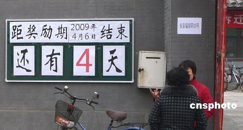 2009年4月2日,北京西长安街拆迁办旁设立的奖励期已进入倒计时第4天。近日,为鼓励拆迁户提前搬走,拆迁办设立了奖励期。据悉,4月6日前签订协议的,每户给予提前搬家奖励2.5万元,重点工程配合奖励5万元,合计7.5万元。考虑到居民周转的困难,还将对此部分居民给予一次性周转补贴1000元/平方米。4月6日后,未签订协议的被视为放弃奖励。 截至目前,拆迁范围内的36家单位已全部与拆迁办签订拆迁协议,大部分单位已开始腾退房屋。而拆迁区内大部分住户也签订了拆迁协议,部分住户已购置了两限房,搬进了新家。 中新社发 玉龙 摄