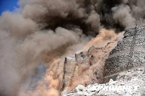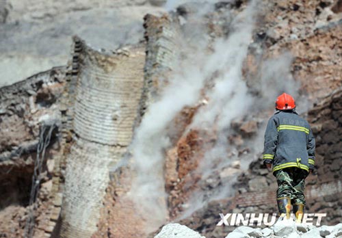 目前,救援工作仍在进行中。由于石灰窑窑口前的台地面积很小,且有一条大裂缝,消防车一时难以驶入;消防人员用高压水枪作业时,水一喷上去窑体即不断塌方,救援难度较大。