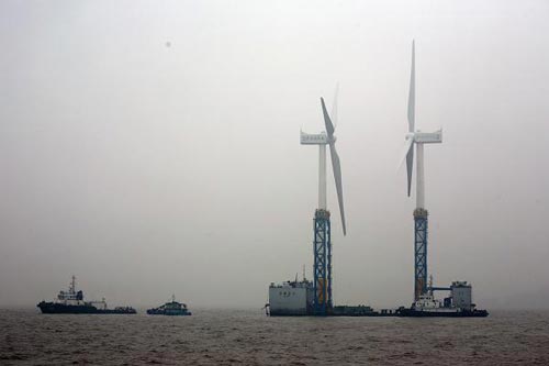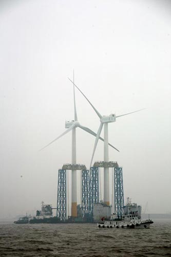 目前,这两台风机正在由大型海上吊装船进行安装工作,预计下周,这两台风机将同时吊装完毕,届时行驶在东海大桥上,侧畔的三架风车将成为别样风景。(沈文敏 张春华)