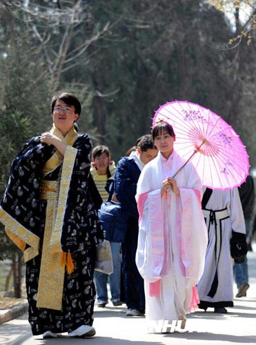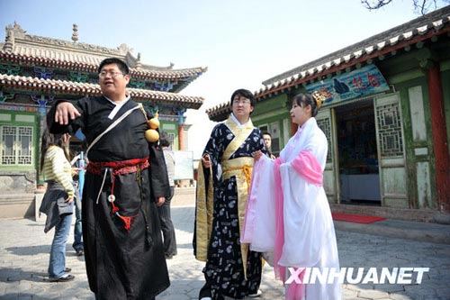 4月5日,传统文化爱好者穿着汉服在兰州白塔山公园踏青游玩。(聂建江)