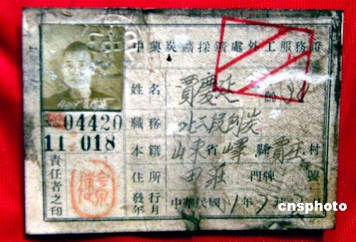 4月6日消息,近日,在山东枣庄发现了民国年间颁发的中兴煤矿公司员工工作证,从民间的角度再次有力地证明了百年中兴公司的煤炭开采史。该工作证全称为“中兴炭矿采矿处外工服务证”,证件上标注的持证人姓名为贾庆延。中新社发 邵飞 摄