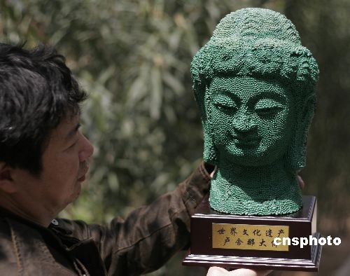4月6日,河南洛阳群众艺术馆雕塑家李明甫展示自己用火柴创作的一尊卢舍那头像雕塑。李明甫曾经创作过三彩、青铜等材质的卢舍那头像雕塑,用火柴进行创作还是第一次尝试。他先用石膏建模,然后用白乳胶将火柴一根根地粘起来。该雕塑高32厘米、重1.8公斤,用时两个月,耗用了近3万根火柴。 中新社发 张晓理 摄