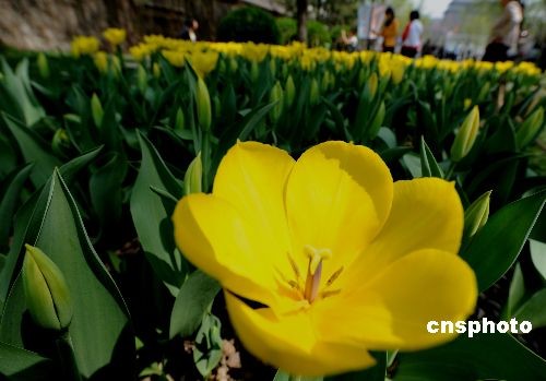 四月七日的北京阳光明媚,市民在公园里踏青观赏郁金香。中新社发 贾国荣 摄