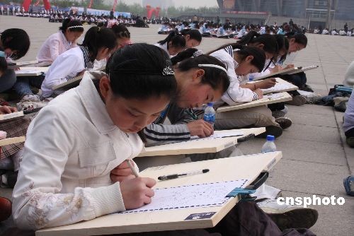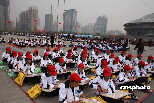 4月10日,共3653人参加“同场同时绘制点线画活动”,象征中国自商代以来3600多年的邮驿历史,所绘点线画为国花牡丹,寓意国运昌盛,世界和谐。这项活动的挑战纪录是2008年12月26日丹东市2490人“同时同场画图”创人数最多吉尼斯纪录。中新社发 王中举 摄