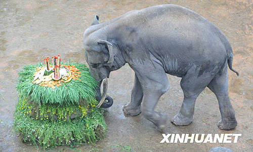 4月11日,大象“帕买”用鼻子接触“蛋糕”。当日,长沙市动物园大象“帕买”迎来了18岁生日,动物园的工作人员特地用青草、水果、胡萝卜等材料制成一个巨型生日“蛋糕”,为它庆祝生日。李尕 摄