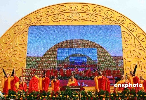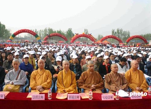 四月十二日上午,山东汶上宝相寺太子灵踪文化节开幕。来自大陆、香港、台湾两岸三地及新加坡等国家和地区的大德高僧及佛学界权威人士云集此间,共同见证修缮后的宝相寺落成典礼暨开光法会。中新社发 王超 摄