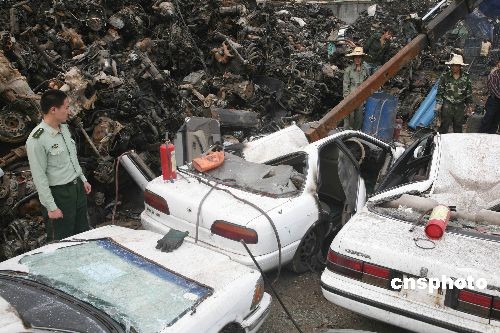 4月12日上午,武警广东省总队深圳市支队警备司令部对近期查获的假冒武警号牌车辆进行集中销毁。此次销毁的重点是近期查获的假武警号牌报废车辆,工作人员在现场对车辆逐一进行分拆、销毁。中新社发 陆建东 摄