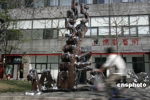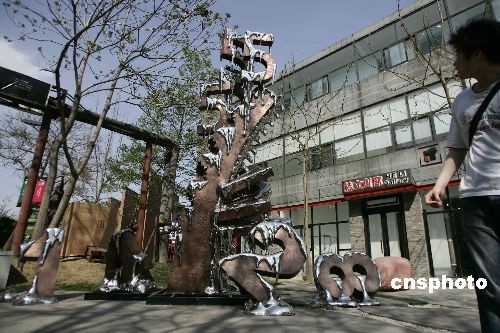 4月13日,一尊由艺术家用不锈钢精心制作雕塑的作品亮相北京798艺术区,以纪念在5·12四川大地震中遇难的同胞。作品用不锈钢加铜雕为坚韧不屈的主体脊梁,叠加的4个“5”似有“呜.....”的哭泣声,3个“2”形似“川”字,共合在“1”座压不垮的脊梁上。中新社发 富田 摄