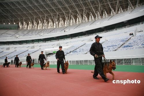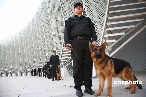 4月16日,济南市公安局民警携带警犬开始24小时执行全运会场馆、设施及场馆周边动态巡逻和检查任务。中新社发 岽东 摄