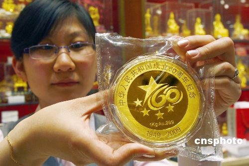 4月16日,为庆祝新中国成立60周年,一套由中国金币总公司限量发行的“中华人民共和国成立60周年纪念金银条、金银章”在北京菜百公司面市,工作人员在展示各款产品。这是第一款纪念中华人民共和国成立60周年的贵金属藏品,具收藏价值。 中新社发 郑雄增 摄