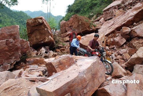 4月17日12时30分许,广西昭平县仙回瑶族乡发生发生严重山体塌方,巨大的山石瞬间将一条乡村公路阻断,所幸无人伤亡。 中新社发 喻湘泉 摄