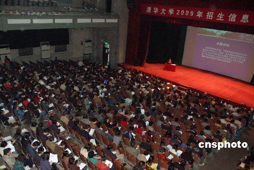 4月19日,北京清华大学招生办主任孟芊在大礼堂介绍招生政策,场内座无虚席。中新社发 赵依依 摄