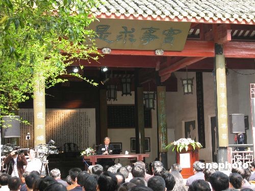 上海世博会首场专题论坛于四月二十日在长沙岳麓书院开讲,主题为“环境与城市发展”。著名学者成思危、中国跨国公司研究会会长王茂林、上海世博会执委会副主任周汉民依次发表演讲。中新社发 刘双双 摄