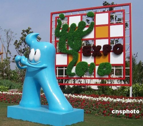 4月20日,一组海宝雕塑和2010上海世博会会徽组合的迎“世博”景观亮相上海街头。随着上海世博会脚步的临近,申城的世博元素愈加丰富。中新社发 周东潮 摄