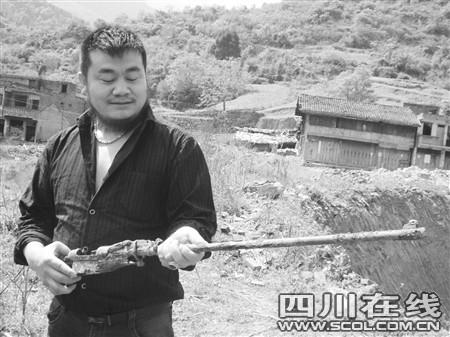 “这确实是枪支,你看这是枪管,这是扳机,木质枪托早已腐烂了,现在根本没有什么杀伤力了!”武都派出所指导员成丕云拿出那位民工主动上缴的3支锈迹斑斑的枪支,分析认为这应该是上世纪三四十年代使用的一种半自动步枪,至于具体型号因为锈蚀太严重暂时无法鉴别。文管部门现场测量的数据表明,残存的枪身长65厘米,枪管口径1.8厘米,扳机处最宽约10厘米。