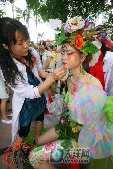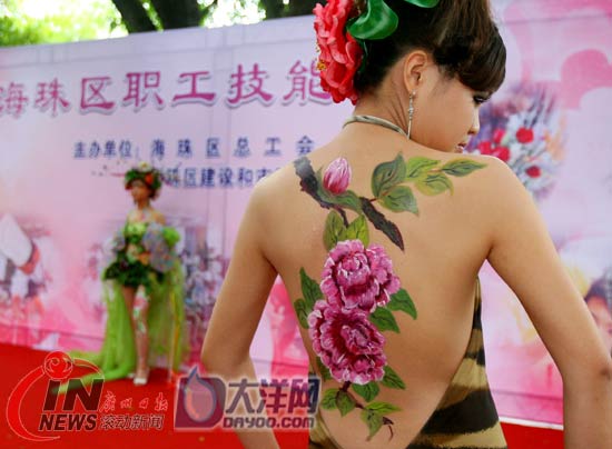 21日上午,为迎接五一劳动节,广州市海珠区组织基层70多个工会,举行了职工职业技能大赛。在比赛中,来自海珠区各基层单位的职工们各显身手,参赛技能包括插花、厨艺、发型设计等方面,而最吸引现场观众瞩目的,当属人体彩绘。参赛者妙手绘春,一幅幅人体彩绘与美女交相辉映,为技能大赛增添了无穷的魅力。
