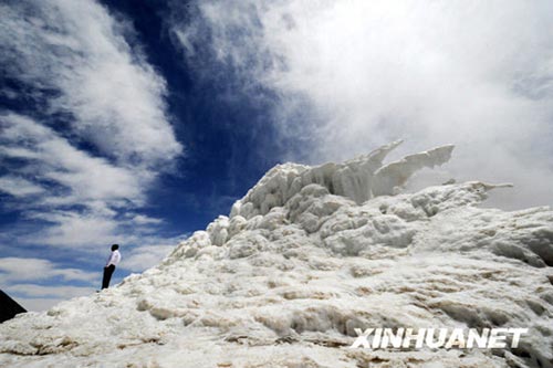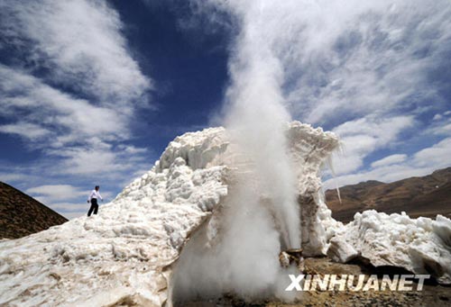 距拉萨150多公里的念青唐古拉山脚下一处地热喷泉,经过一个冬天的喷涌结冰,形成美丽的地热冰塔奇观,成为一大旅游景观。(李月 摄)