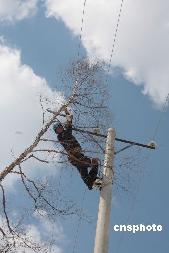4月23日,当牡丹江市电业抢修人员将三道林场内最后一处电线杆上的刀闸闭合,7000多户因暴雪导致断电的人家,终于重新恢复正常的生产生活。 4月21日,黑龙江省牡丹江市出现雨夹雪天气,其中牡丹江市三道林场的局部林区因当地“小气候”影响遭受暴雪袭击,最深处的积雪厚度达到1米以上,林区内的一些林木被大雪压断,通过林区内的部分供电线路短路。从4月21日至4月23日,牡丹江市电业系统出动100多名抢修人员奋战在40多公里的林区供电线路上,及时排除短路故障及线路险情。直到4月23日下午1点30分,各个停电村屯才陆续恢复供电。中新社发 庄文斌 摄